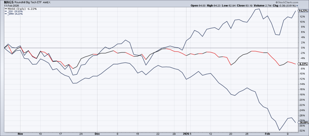 You can see this in the performance of semiconductor stocks (SMH), the Magnificent 7 (MAGS) and software stocks (IGV) since October 29, 2025. However, I believe this trade has mostly played itself out and am taking the other side at this point, buying software stocks and avoiding semiconductors.