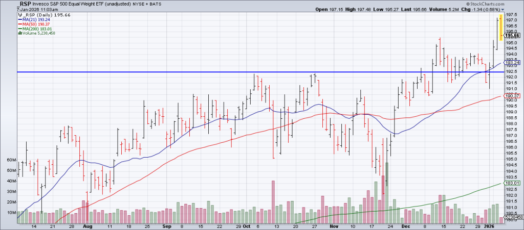 The S&P Equal Weight ETF (RSP) has been quite strong and is driving the move higher in the overall index at the moment. It struggled to get through $192.50 in late October but is now decisively through that level, closing Tuesday at $197.00.