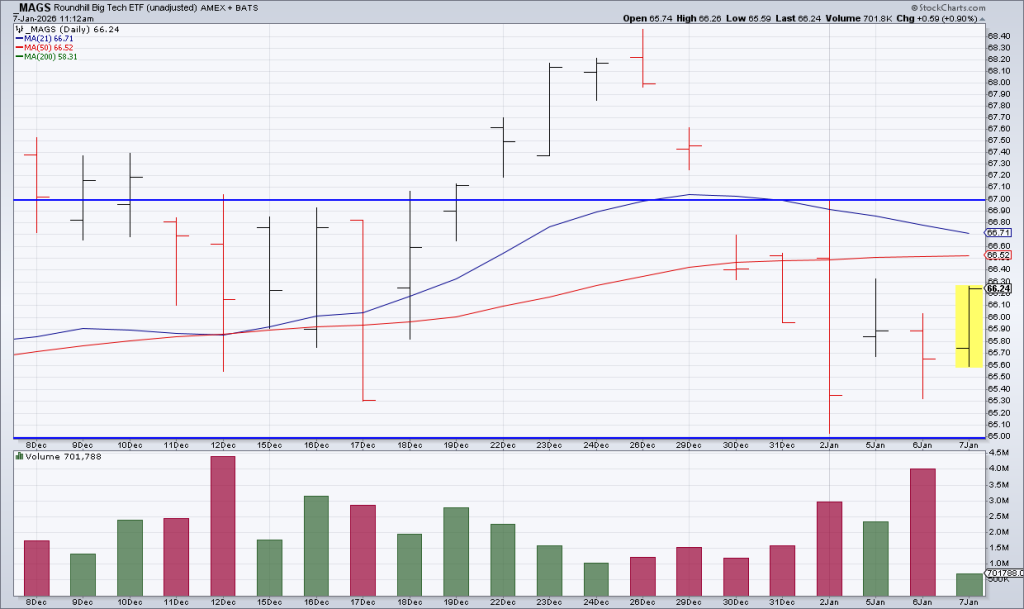 Based on this analysis, I initiated a starter short position in MAGS on Monday at $66.14. I will cover this short at $66.20 and add to it below $65. I am focused on the big candle with a range of $65-$67 from the first trading day of the year (Friday January 2, 2026). (Please use very tight risk management when shorting or don’t do it at all as it is generally a losing strategy).
